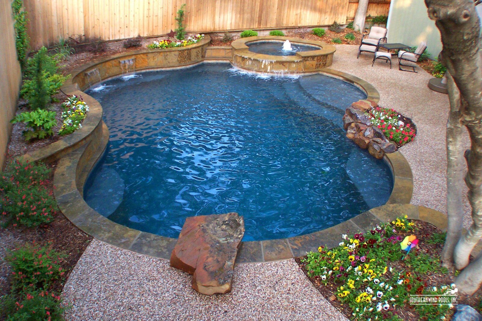 Piscina spa. Anche in questo caso la grandezza della piscina è perfetta per occupare anche i 2/3 dello spazio esterno a disposizione. Il pavimento scelto si abbina perfettamente alla roccia utilizzata per delineare la forma. Una piccola costruzione naturale ombreggiata dal verde, che delimita e al contempo regala personalità ad uno spazio che ospita anche uno scivolo. Una piccola cascata al di là della quale si crea un angolo appartato ed una piccola zona idromassaggio.