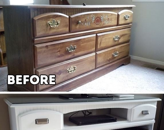 I mobili vecchi dall’aspetto antiquato possono assumere tutt’altro aspetto con una semplice riverniciata. Inoltre, per renderli ancor più al passo coi tempo, possiamo rimuovere dei cassetti ed usarli per alloggiare i dispositivi elettronici oppure sostituirli con dei box che staccano la monotonia del colore.