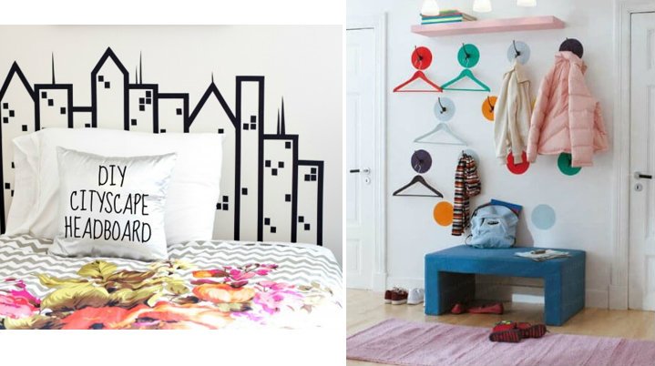 Se in camera da letto abbiamo una semplice rete senza testiera, magari perché quella vecchia si è rovinata e non abbiamo ancora provveduto a cambiarla, l’ideale è risolvere con il solito adesivo murale. Quando è sotto forma di classico rotolo di scotch possiamo divertirci a creare qualsiasi tipo di forma.