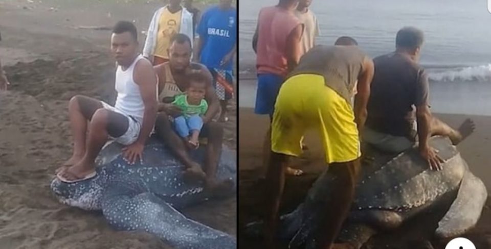Alcuni ragazzi cavalcano una tartaruga in via di estinzione mentre depone le sue uova in spiaggia…