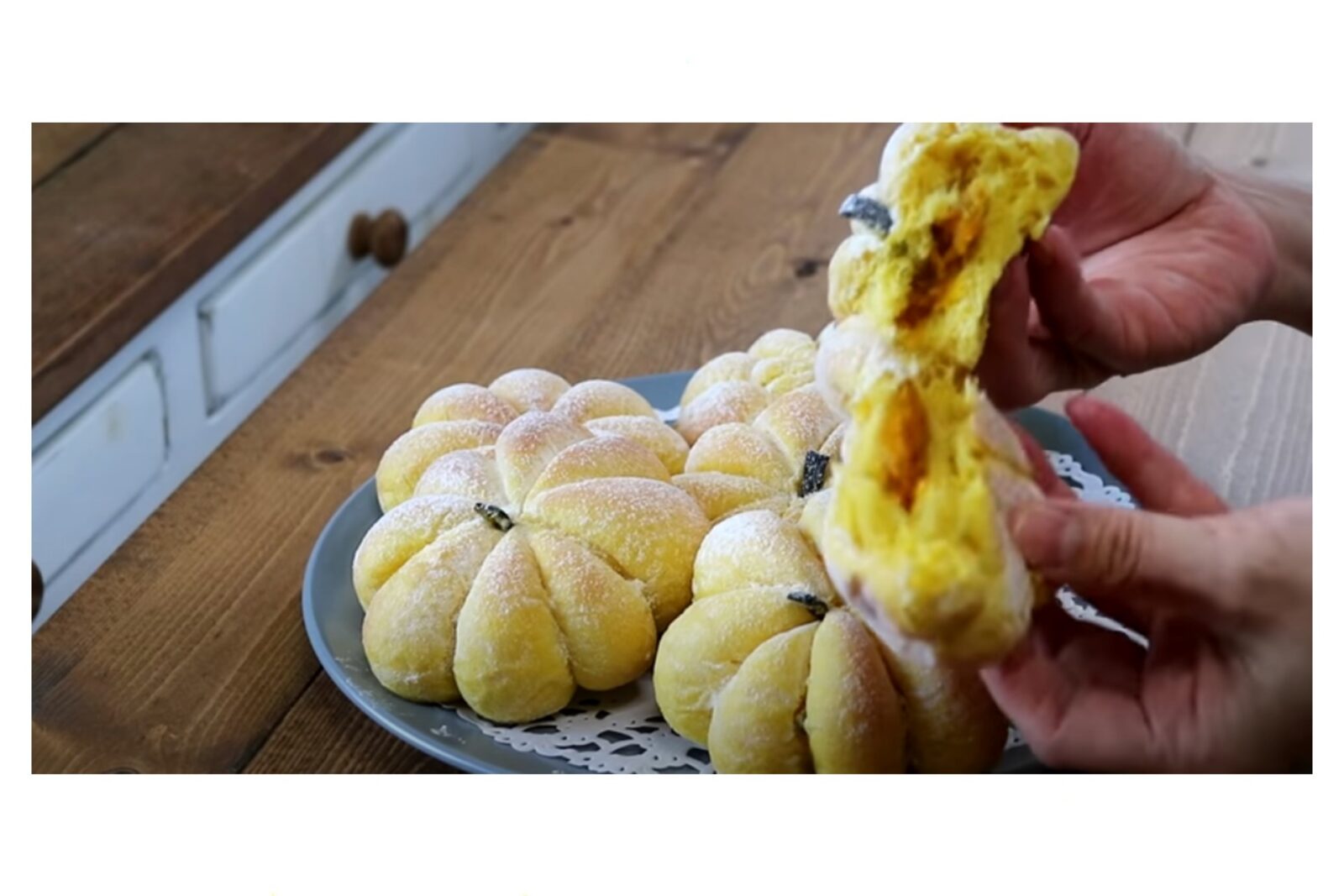 Adagiare sopra le sfere un canovaccio pulito e leggermente bagnato con un po’ di acqua e lasciare lievitare l’impasto per ulteriori 15 minuti. Al termine del tempo di riposo, stendere con le mani ogni panetto e adagiare in ognuno una sfera di ripieno. Chiudere l’impasto su se stesso e con lo spago da cucina, dare forme alle vostre zucche.