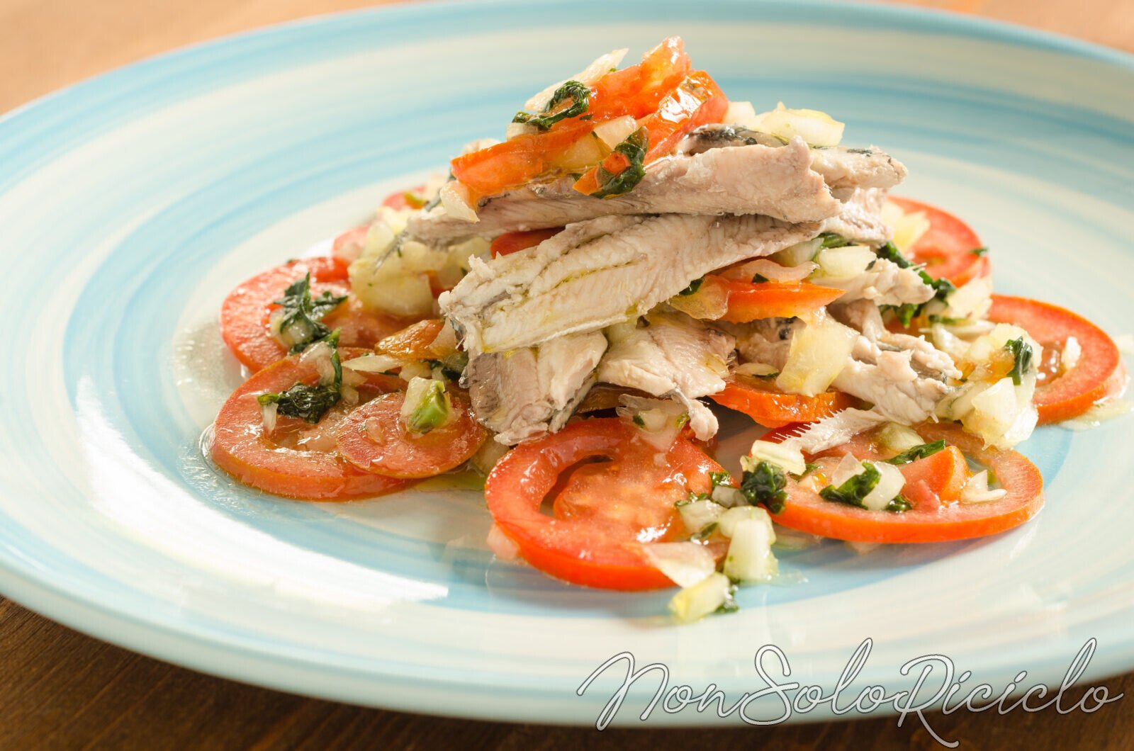 Prendere i pomodori, lavarli sotto l’acqua corrente e con un coltello affettarli. Adagiare le fette di pomodori su un piatto, aggiungere le acciughe con la sua marinatura e decorare con qualche foglia di prezzemolo fresca.