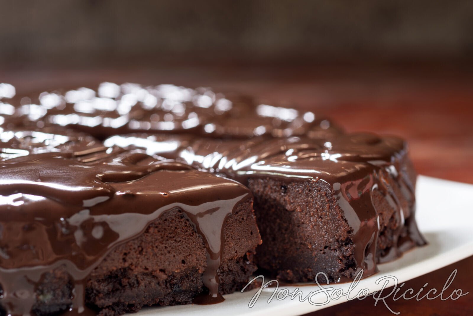 Togliere la torta dallo stampo a cerniera e ricoprire la sua superficie con la glassa di cioccolato preparata in precedenza. Stendere la glassa con un cucchiaio o con una spatola, in modo che coli un po’ sui bordi.