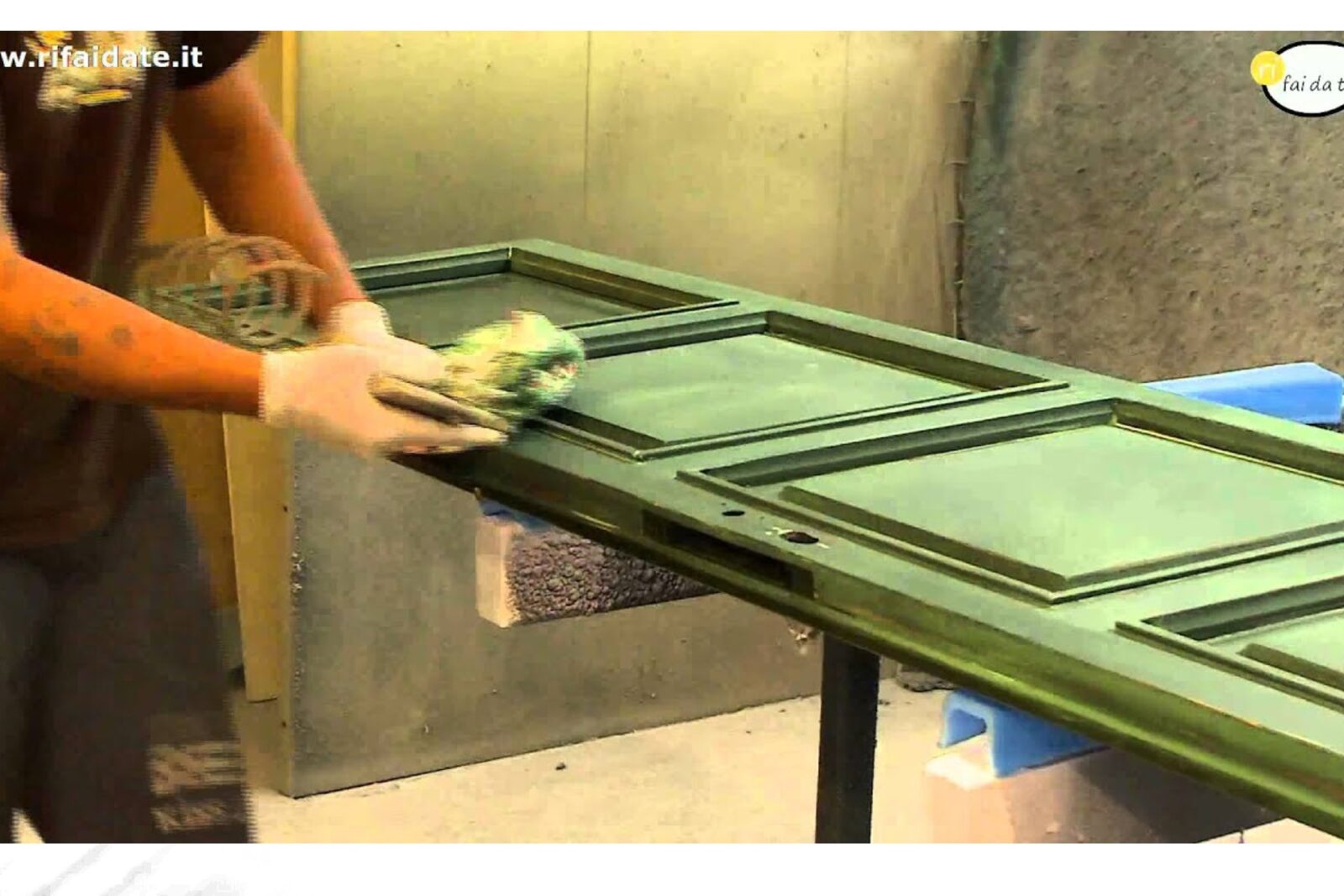 Per prima cosa smontate la porta sfilandola dalle cerniere, adagiatela su dei cavalletti di legno, o in alternativa su una superficie piana; con l’aiuto del cacciavite smontate la serratura e la maniglia e con lo straccio imbevuto nella candeggina, rimuovete le impurità e le macchie.