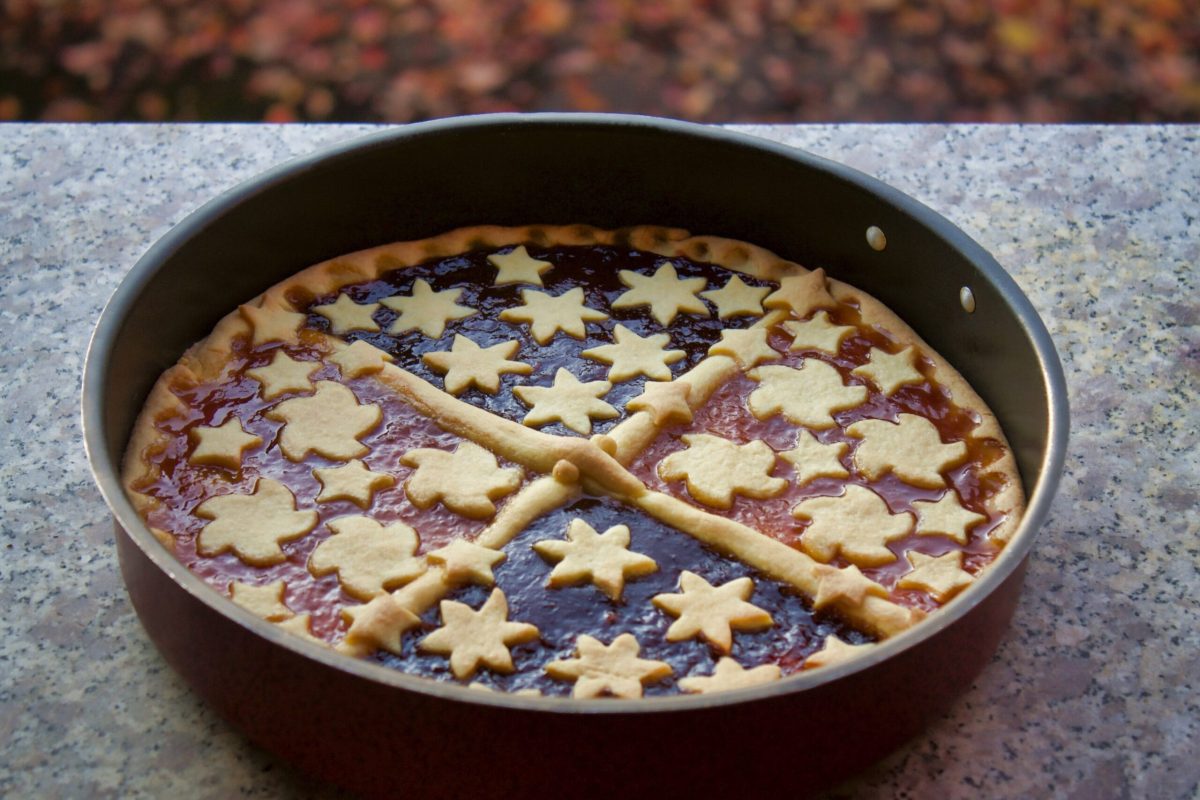 Sistemiamo questi ultimi a croce sulla nostra base in modo da ricavare 4 sezioni. Stendiamo le marmellate alternandole e decoriamo con i fiori, i tondini o le stelline. Inforniamo (a 180°) per 35/40 minuti.