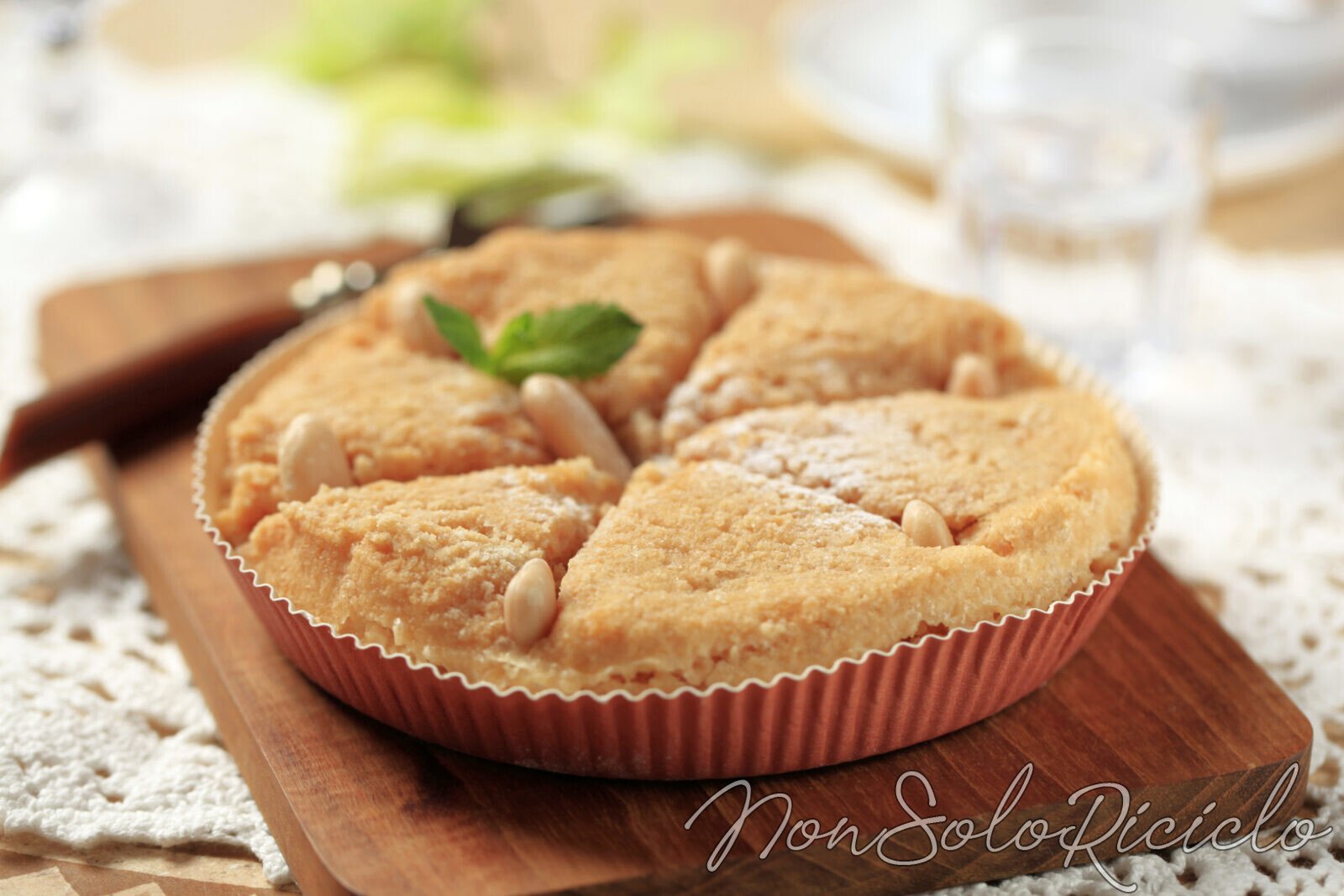 Togliere la pasta frolla dal frigorifero e dividerla in due parti. Con l’aiuto di un mattarello stendere una parte di pasta frolla e adagiarla sopra una teglia ricoperta con carta da forno. Bucherellare il fondo con una forchetta e versare all’interno il ripieno, stendendolo con una spatola in modo uniforme. Utilizzando sempre il mattarello, stendere la seconda parte di pasta frolla e adagiarla sopra la base, premendo un pochino i bordi per farli aderire. Con un coltello creare delle incisioni, dividendo già la torta in 6 fette uguali.