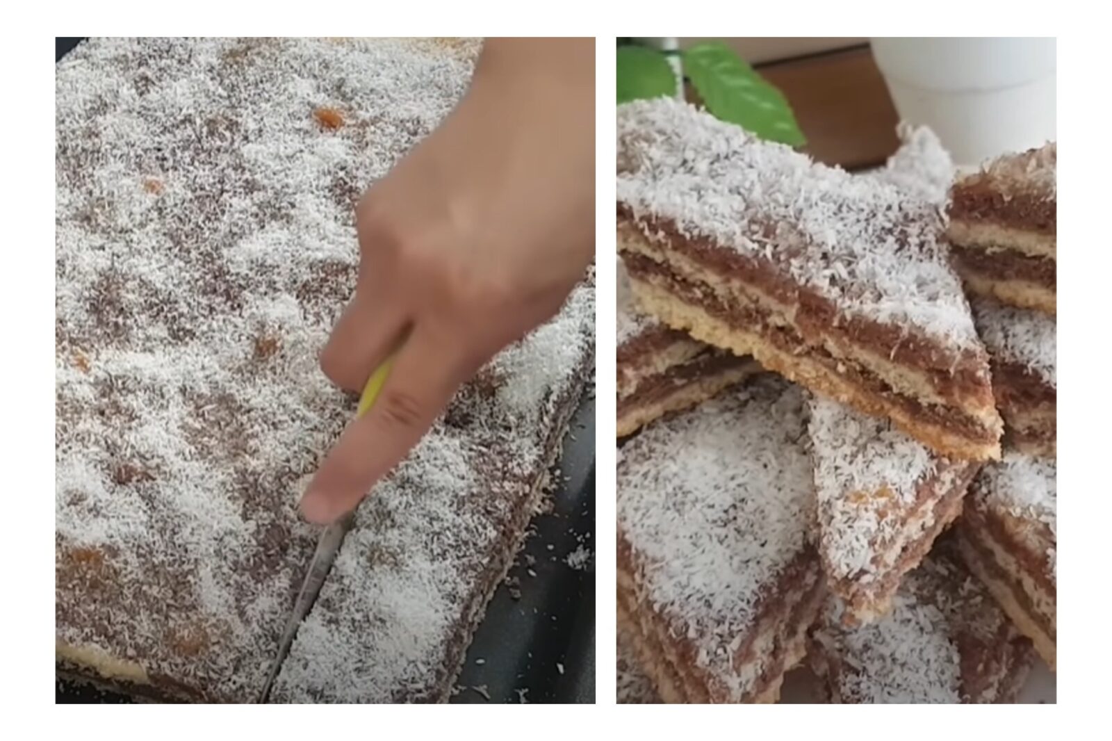 Usando un pennello da cucina, stendere il composto sopra il dolce. Cospargere con abbondante cocco grattugiato, tagliare il vostro dolce marocchino prima a strisce, e poi a rombi.