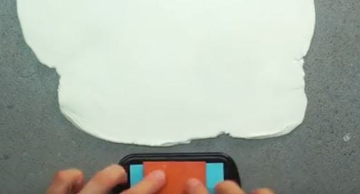 Stendiamo la pasta modellabile assicurandoci di lasciare uno spessore di circa 5 millimetri. Prendiamo il nastro o il rullo decorativo, intingiamolo nel colore, lasciamo scorrere il liquido in eccesso, e con calma incidiamo lo strato di argilla steso.