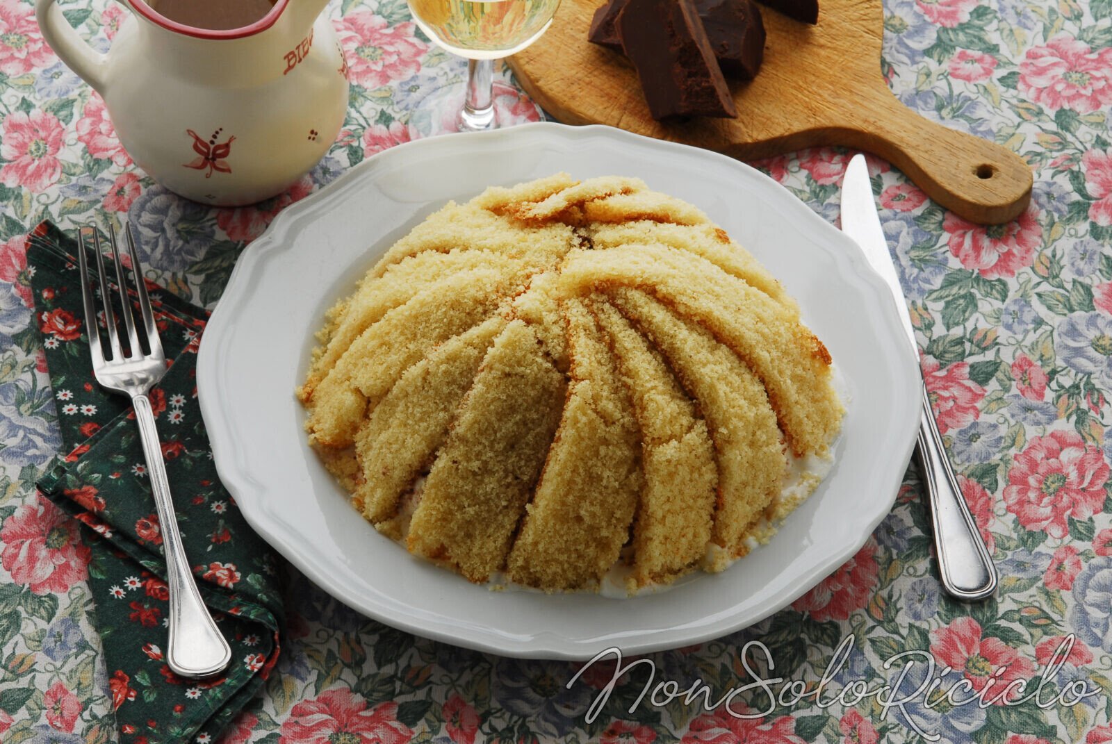 Quando la pasta-biscotto è fredda, la tagli a fette più o meno rettangolari spesse all’incirca tre centimetri, che poi immergi in una bagna di rum e acqua e disponi dentro uno stampo a forma di cupola, a ricoprirlo per intero.