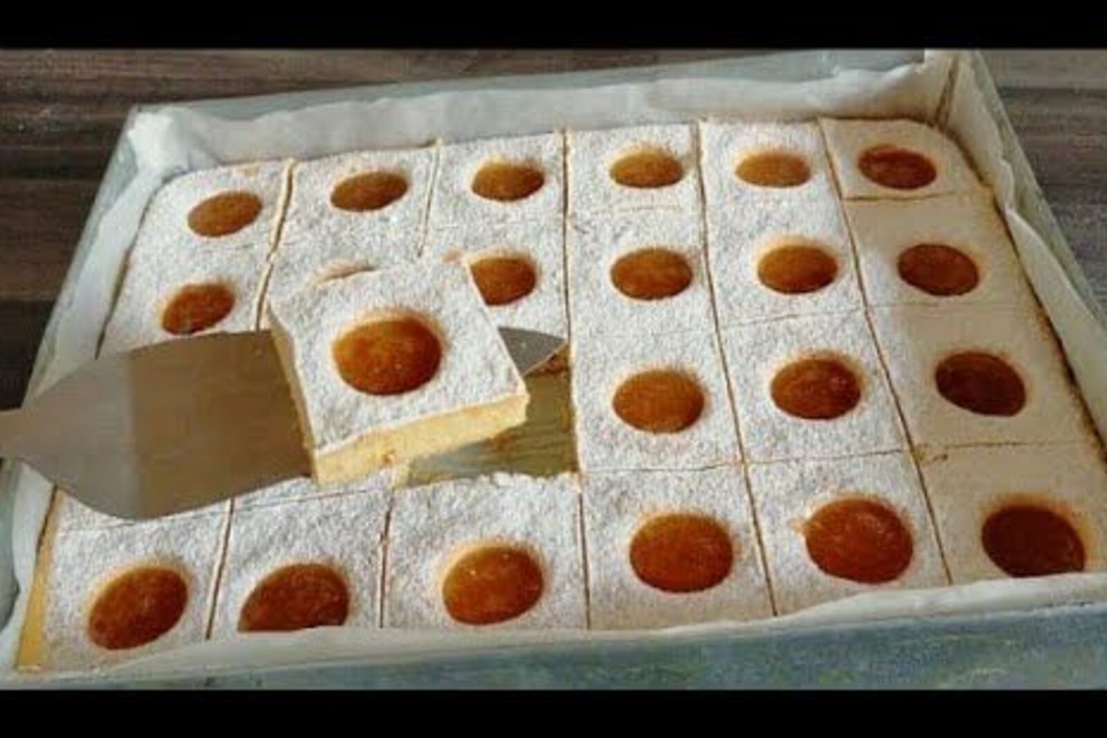 Quando la base è cotta, ci si spolvera sopra dello zucchero a velo abbondante e poi si riempiono i fori che abbiamo praticato prima con della marmellata di arance, servendoci di un cucchiaino.
