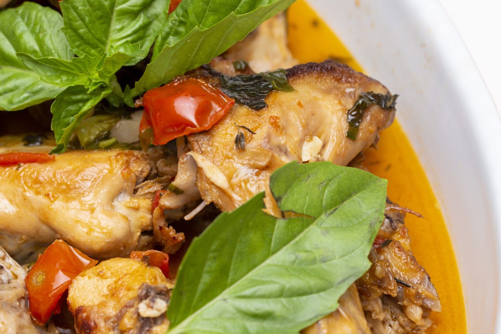 Gli ingredienti che servono sono (per 4 persone): un chilo di carne di coniglio; 300 grammi di pomodorini; uno spicchio d’aglio; quanto basta di olio extravergine d’oliva, vino bianco, sale, pepe e basilico.