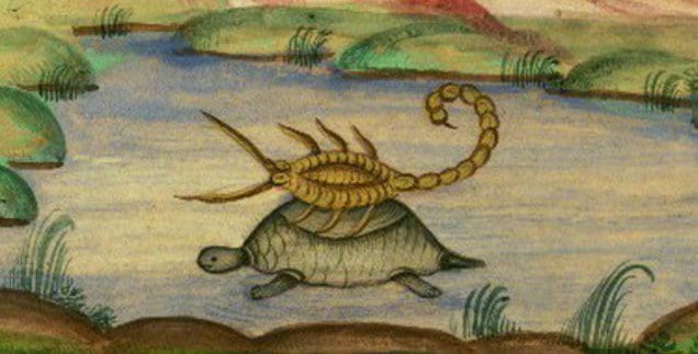 “Lo scorpione e la tartaruga” è una fiaba spesso attribuita ad Esopo, di cui tuttavia esistono molte varianti. Essa probabilmente risale al Panchatantra una raccolta di favole di animali risalenti all’India del III secolo a.C.