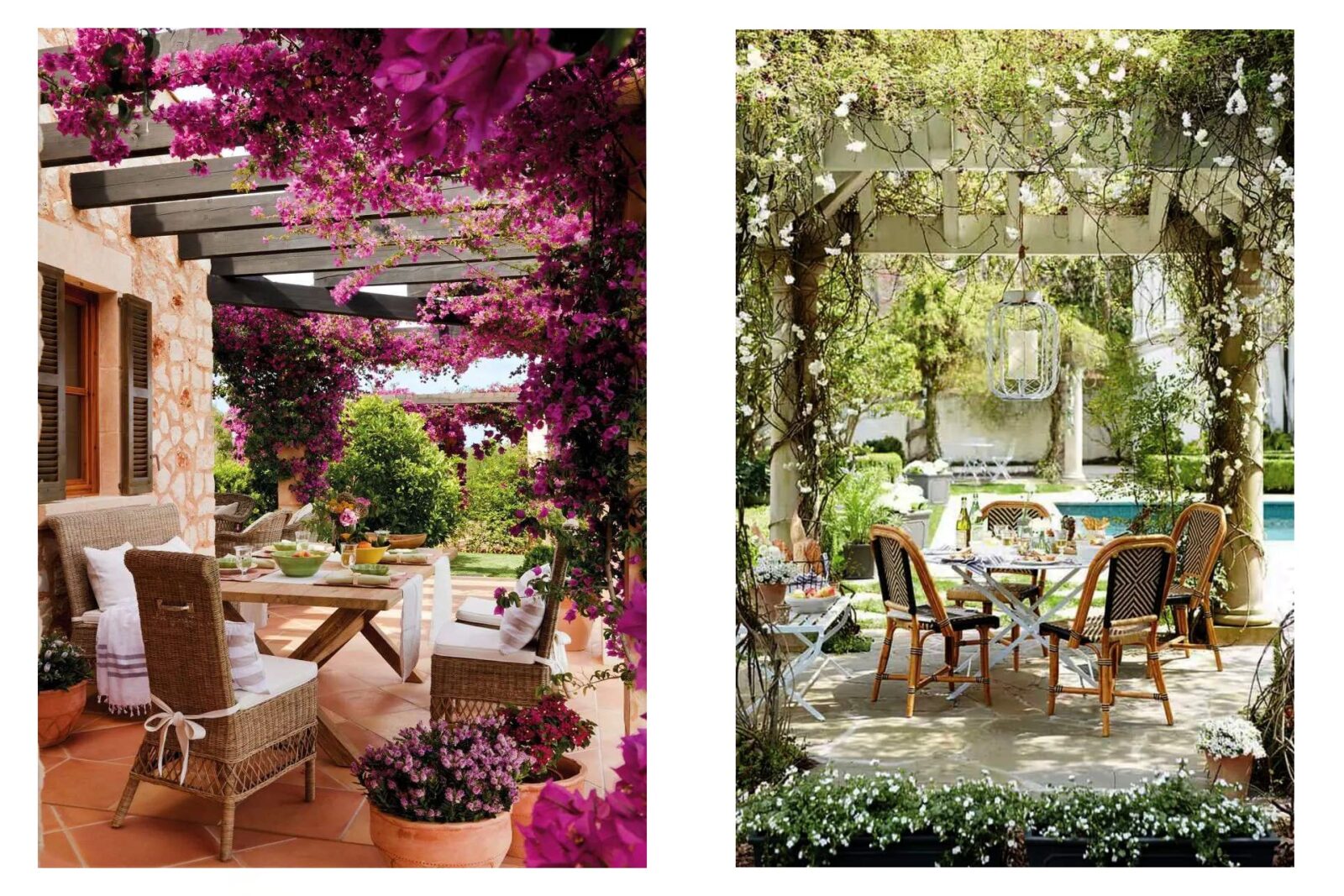 Qui è un trionfo di toni caldi e intimi, oltre che di una meravigliosa e straripante bouganvillea. Non esattamente elegantissime le sedute legate dietro alle spalliere…
