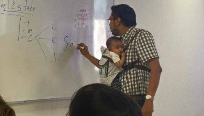 Questo professore si prende cura del figlio di una studentessa per consentirle di seguire la lezione