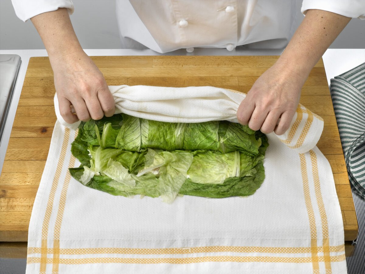 Trascorso il tempo di cottura, aiutandovi con un paio di pinze da cucina, estrarre la lattuga dalla casseruola ed adagiatela sopra un tagliere. Con un coltello, togliere la parte più dura e sistemare le foglie, leggermente sovrapposte sopra un canovaccio pulito.