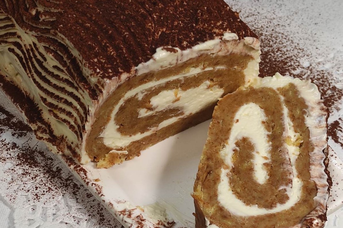 Ricopriamo il rotolo con la crema tiramisù rimanente. Spolveriamo con zucchero a velo e mettiamo in frigo per un’oretta prima di servire, oppure se ci occorre nell’immediato 20 minuti nel freezer saranno più che sufficienti.