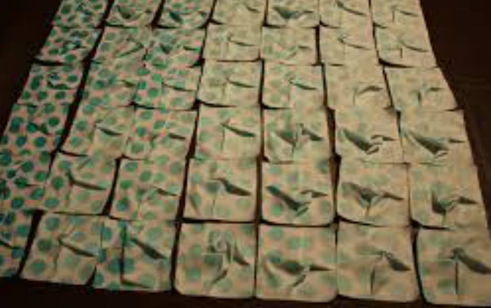 Ora passiamo al tessuto scadente (che non sarà visibile). Da questo tessuto ritagliamo un quadrano di dimensioni inferiori (circa 3cm in meno) rispetto a quelle dei quadrati precedenti. Ci servirà un quadrato di tessuto “scadente” per ogni quadrato di tessuto “buono”.